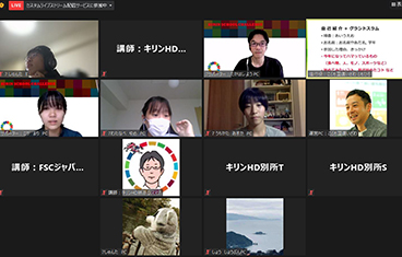 参加者が疑問に思ったところは、参加しているFSCジャパンやキリンの担当者がブレイクアウトルームを巡っていく中で回答していきます。