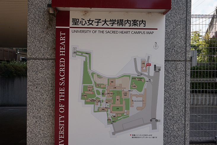 (聖心女子大学4号館の入り口にある田窪恭治さんの作品「黄金の林檎」の前で撮影したFSCチーム参加者の皆さん)
