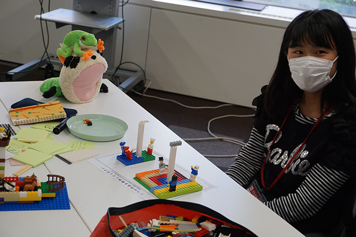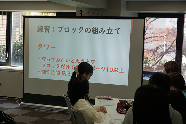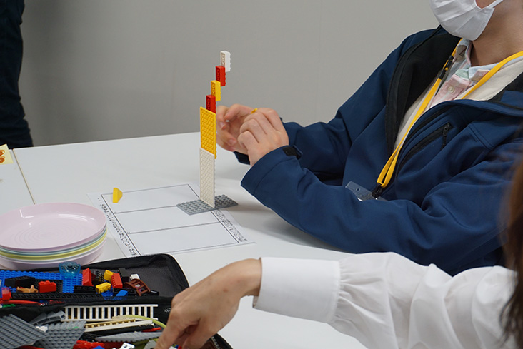 まずは、3分程度での「登ってみたいと思うタワー」の製作。その後に、持ち時間1分程度で「なぜ、そのタワーを作ったのか」を説明し、残り1分でチームメンバーから、「なぜその高さなのか?」「なぜ、そのレゴの色を使ったか?」などの質問を受けます。