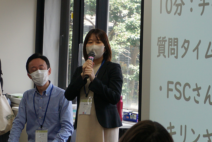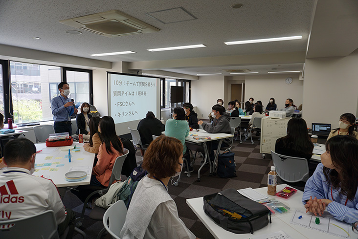 チーム毎に、動画を見て生じた疑問を共有して話し合い、1つか2つ質問したいことを決め、FSCやキリンの担当者に質問します。認証が必要な背景などの質問に加えて、「キリンの社員の一日のスケジュールを教えてください」という素朴な質問もあり盛り上がりました。